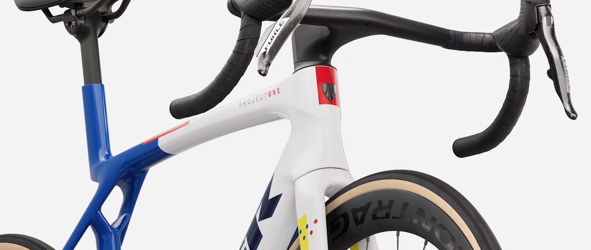 La potence et le cintre sont entièrement intégrés. Le prolongateur aéro avec commandes eTap SRAM vous permet de rester en position basse sans quitter les aéros. La selle Bontrager Hilo est spécifiquement étudiée pour la position triathlon.